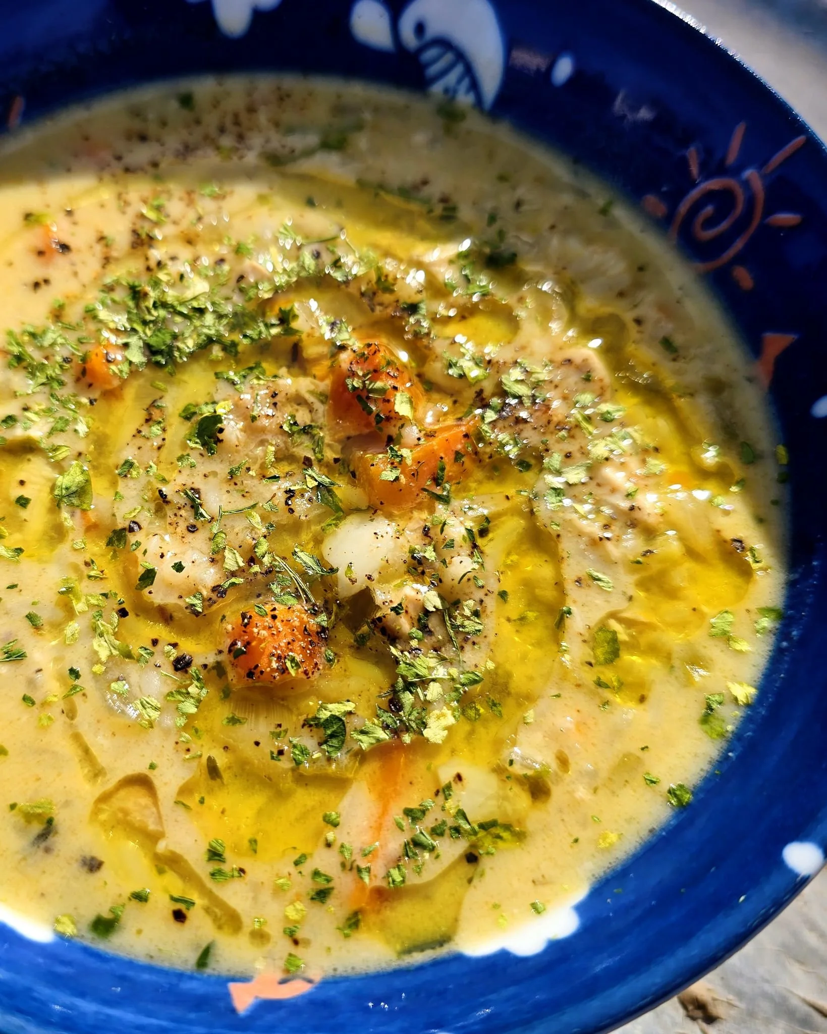 Garnish with fresh or dried parsley, celery leaves if you have them, a drizzle of olive oil, lemon zest, and a final crack of black pepper. Serve on its own or with crusty bread.